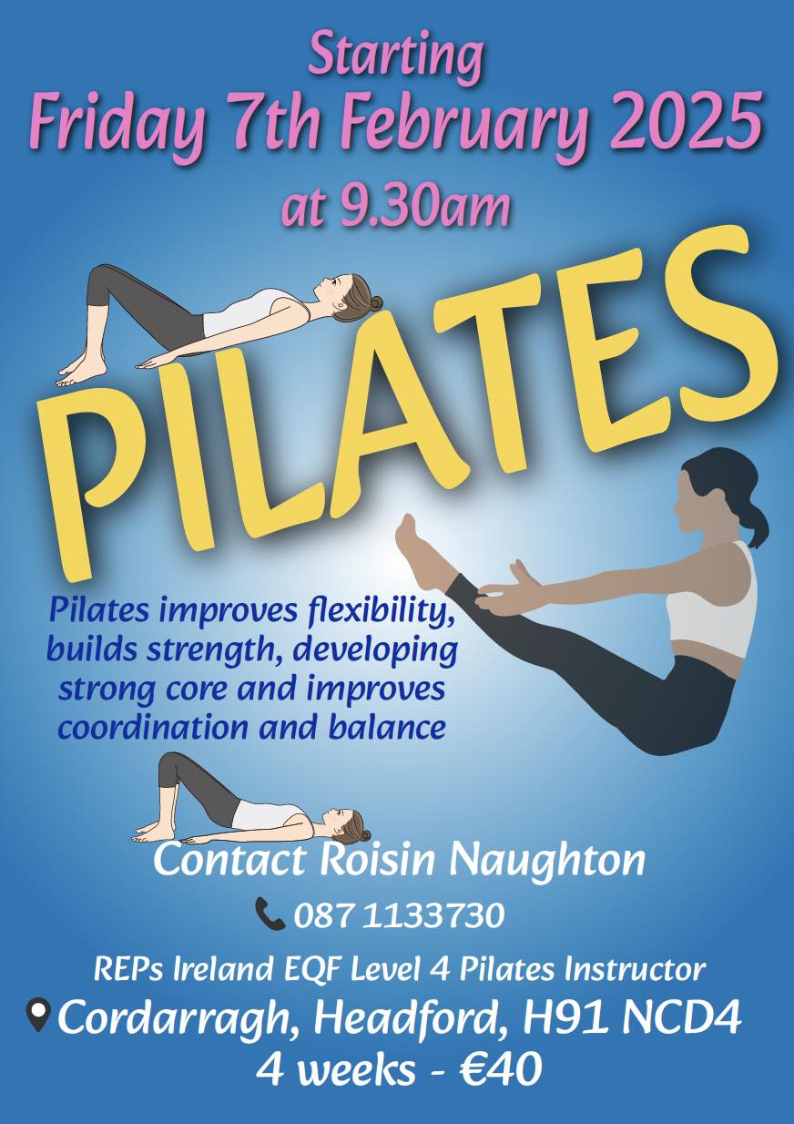 Roisin Naughton has announced a new Pilates class in Headford. Join Roisin on the mat every Friday morning at 9.30am as she works with you to build a stronger, better and more flexible you! Pilates improves flexibility and builds strength, developing strong core and improves coordination and balance. Contact Roisin Naughton at 087 1133730 REPs Ireland EQF Level 4 Pilates Instructor Cordarragh, Headford, H91 NCD4 4 weeks – €40