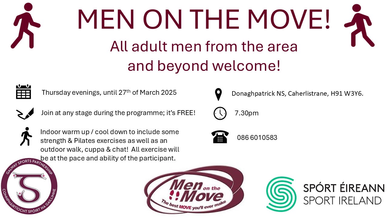 Following a very successful information night on Thursday last, the Men on the Move continues this Thursday evening, 13th of Feb at 7.30pm in Donaghpatrick NS, Caherlistrane. New attendees are very welcome!
